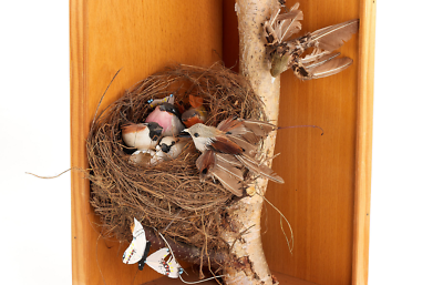 Sehr attraktive Natur Szenerie, die den seltenen Fernauslöser und Winder OOFRC “in Aktion” zeigt, der mit zwei Kabeln betrieben wird, eines zum Aufziehen, das andere zum Auslösen, in gutem Zustand und funktionsfähig, montiert auf eine Leica I Mod. C mit Elmar 3,5/5 cm, mit 55 cm hohem Diorama, hergestellt vermutlich in den 1950-60er Jahren, definitiv ein schönes Set