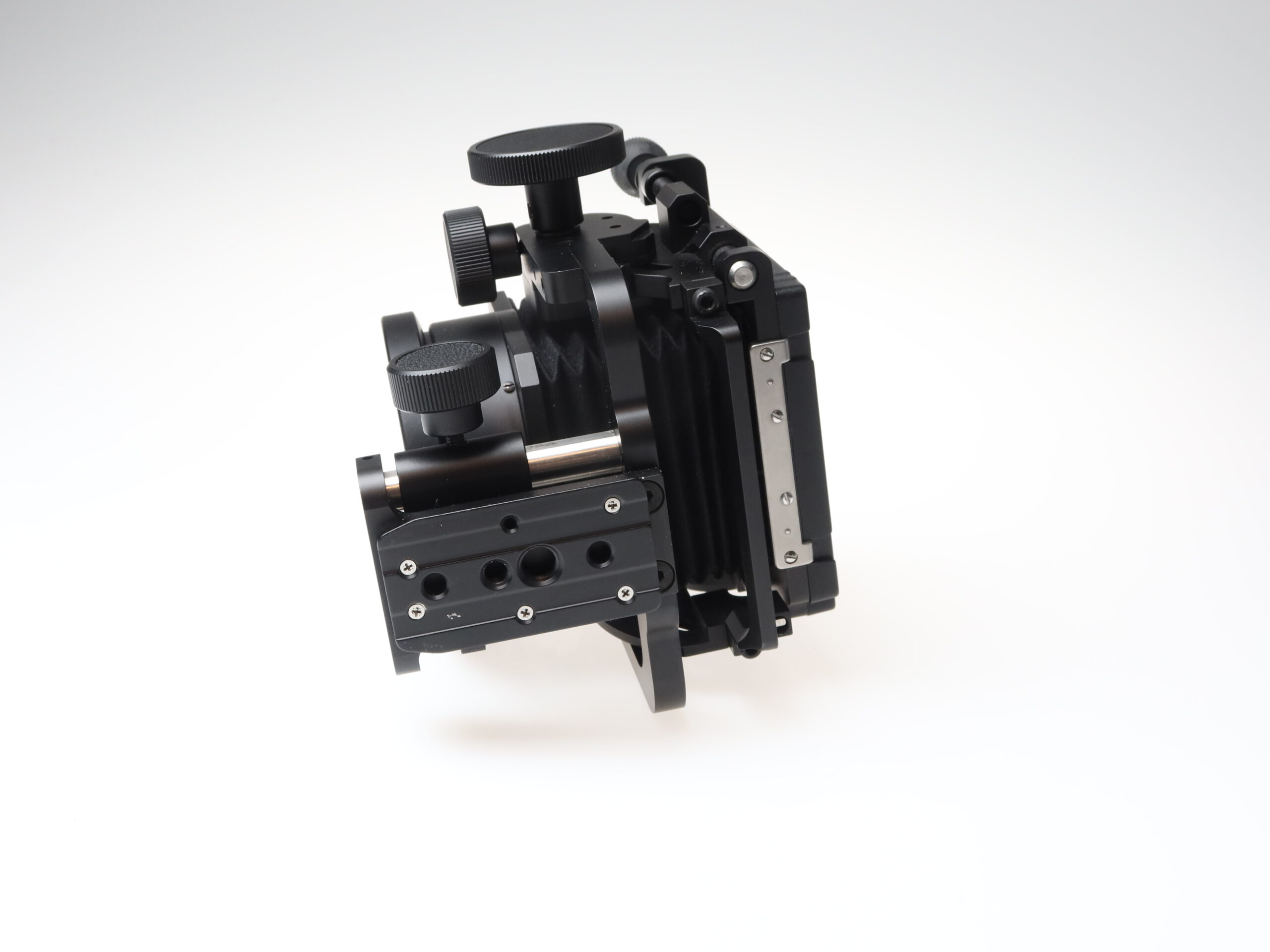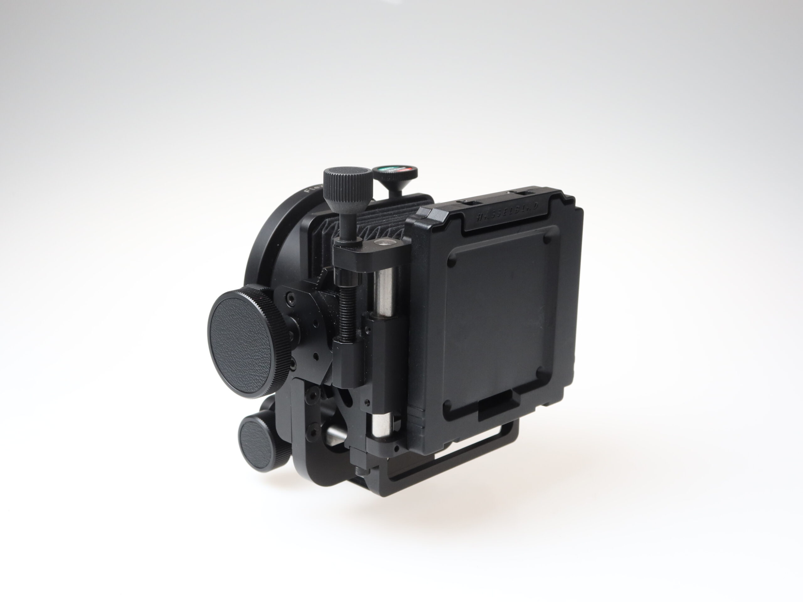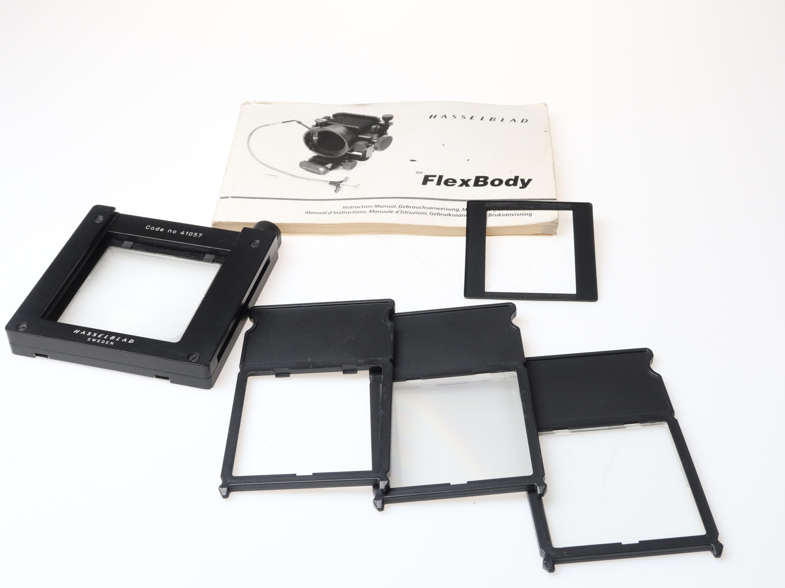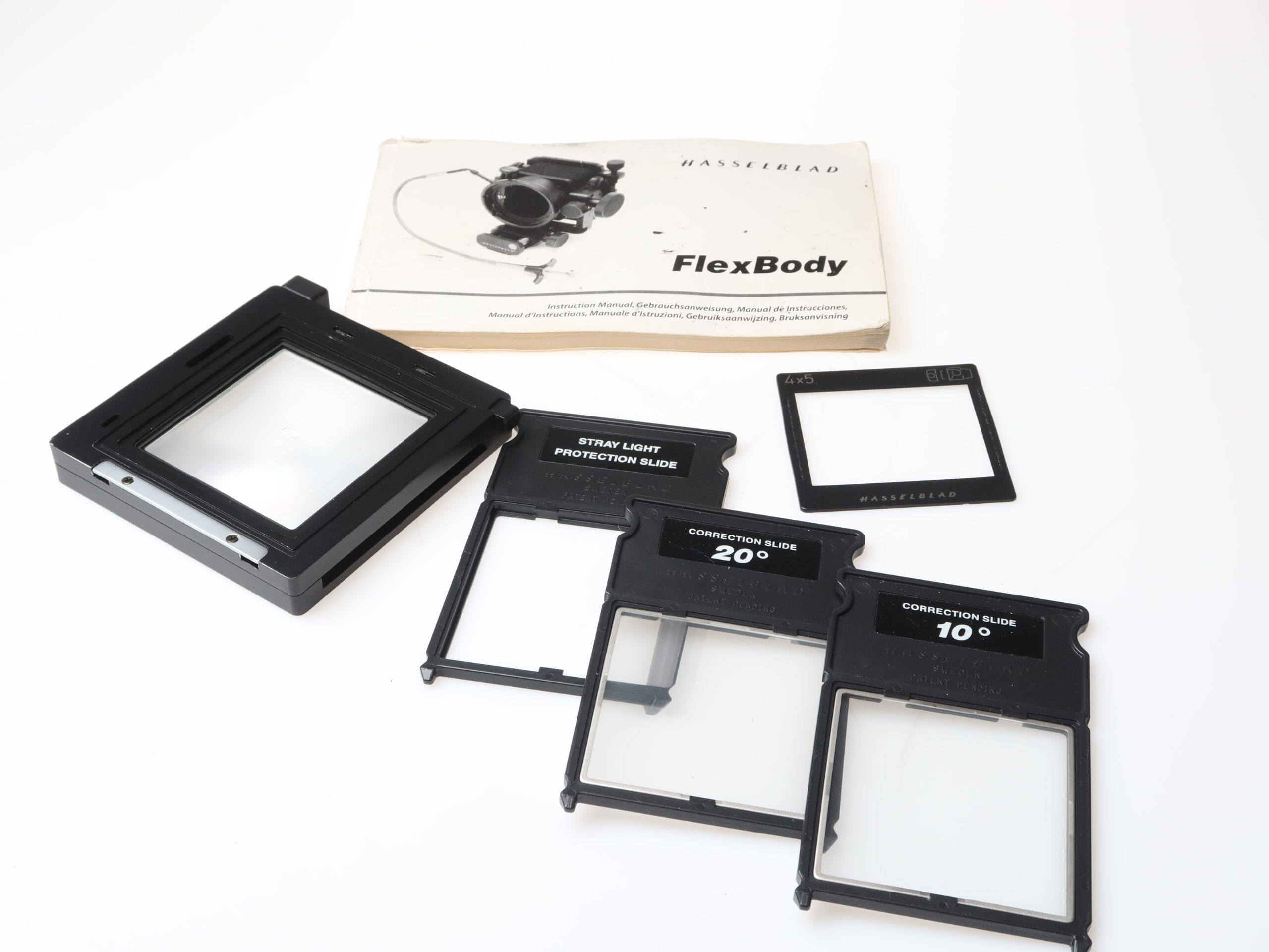 Hasselblad Flex Body 72109 (No. 451ER1085), 4×5 frame, 10° correction slide, 20° correction slide, Stray Light Protection slide, frame (No. 41057) with ground glass screen (grid and split window).
