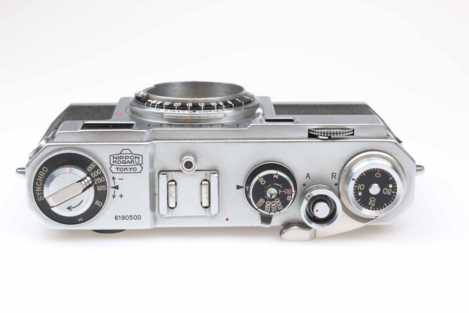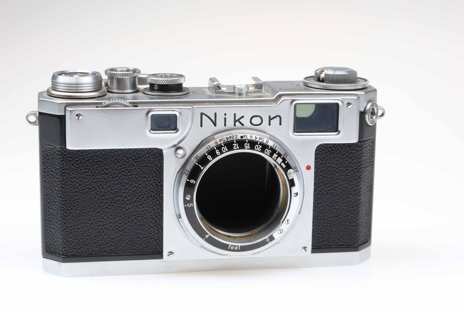 Nikon S2 camera black dial late S2 (No. 6190500): The housing is in good condition with normal signs of use.