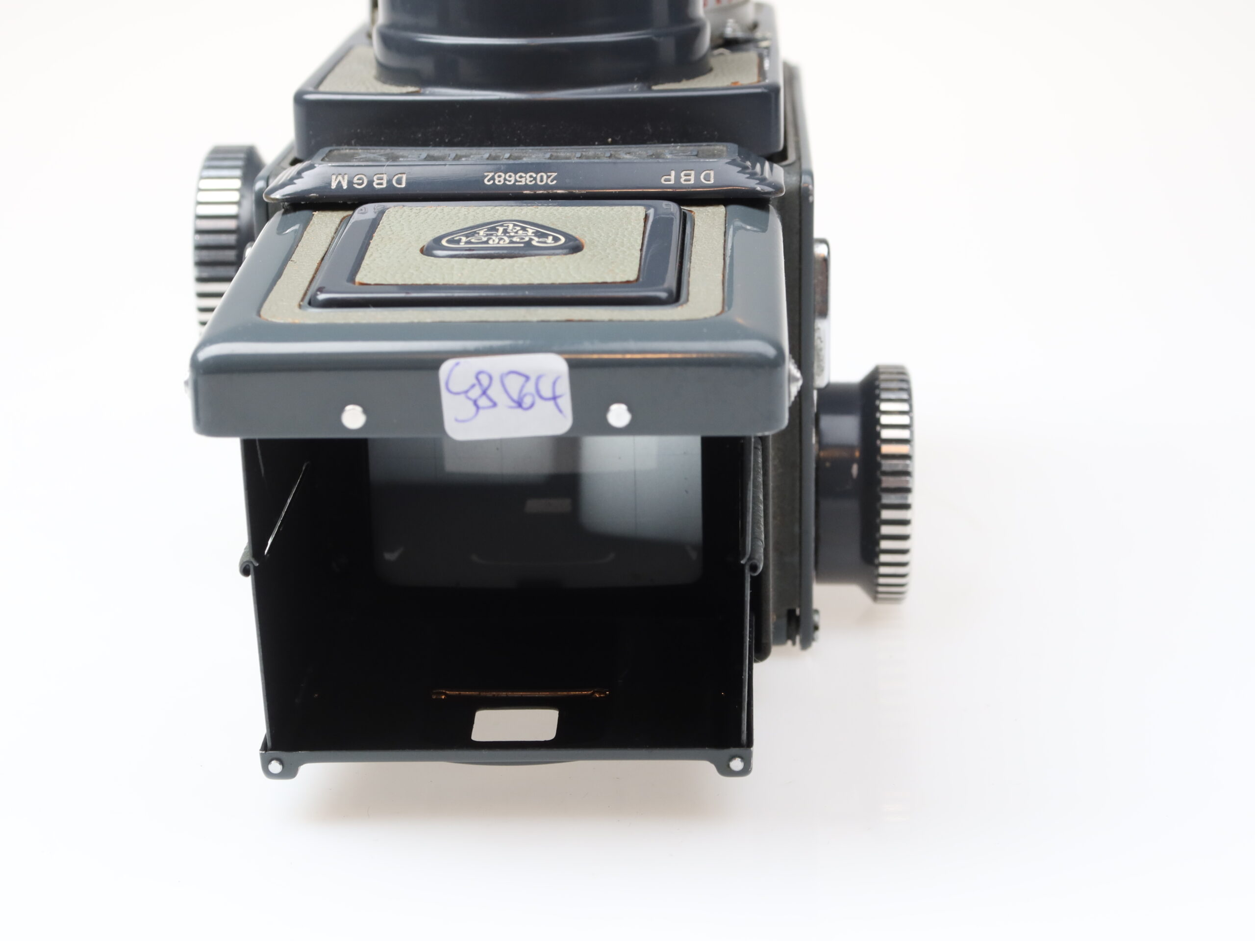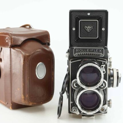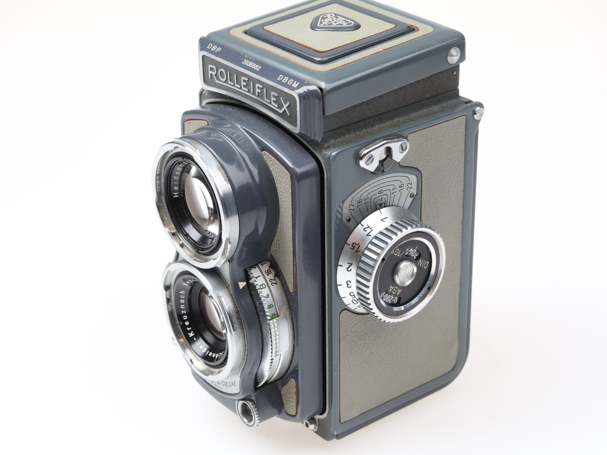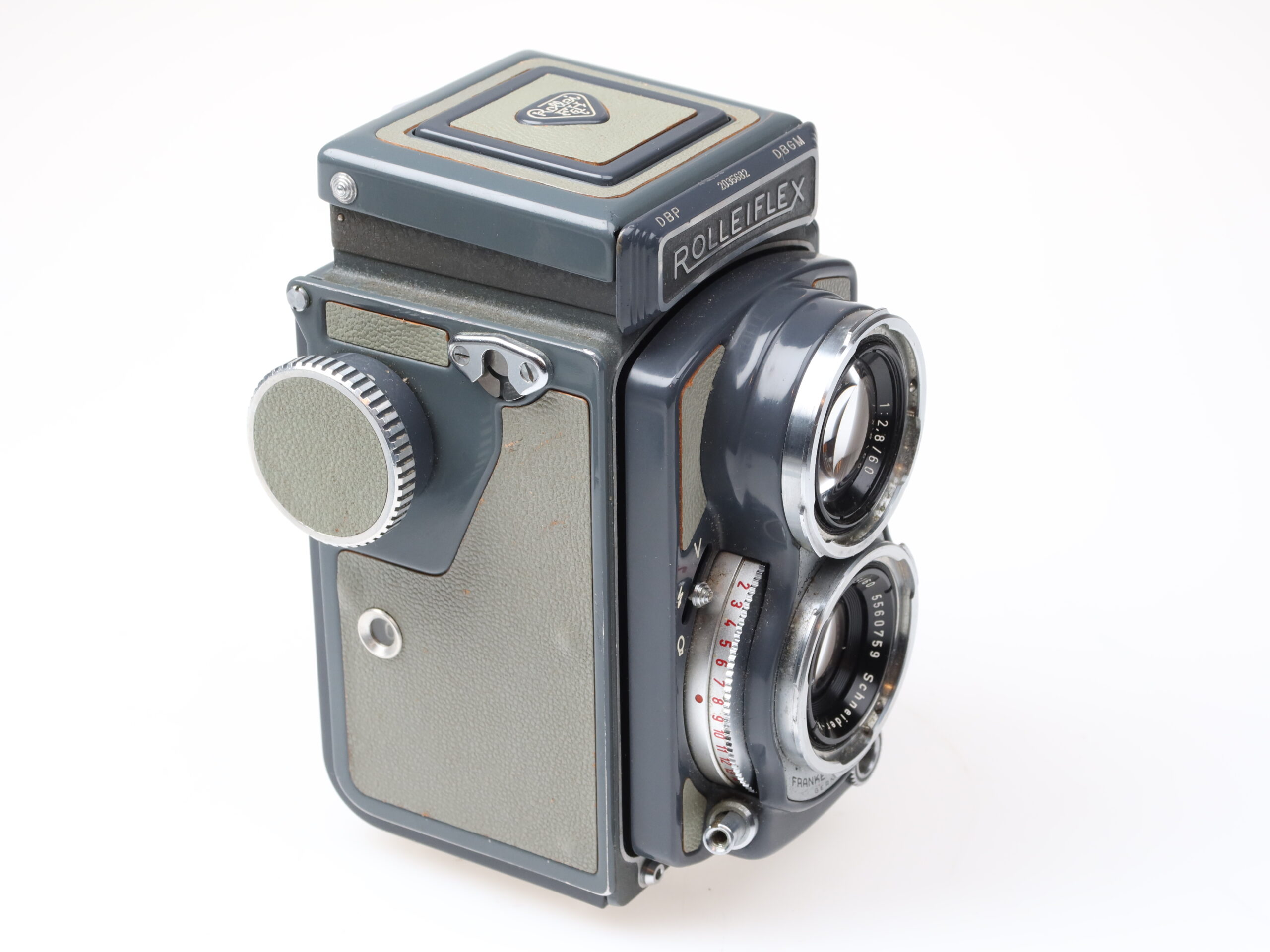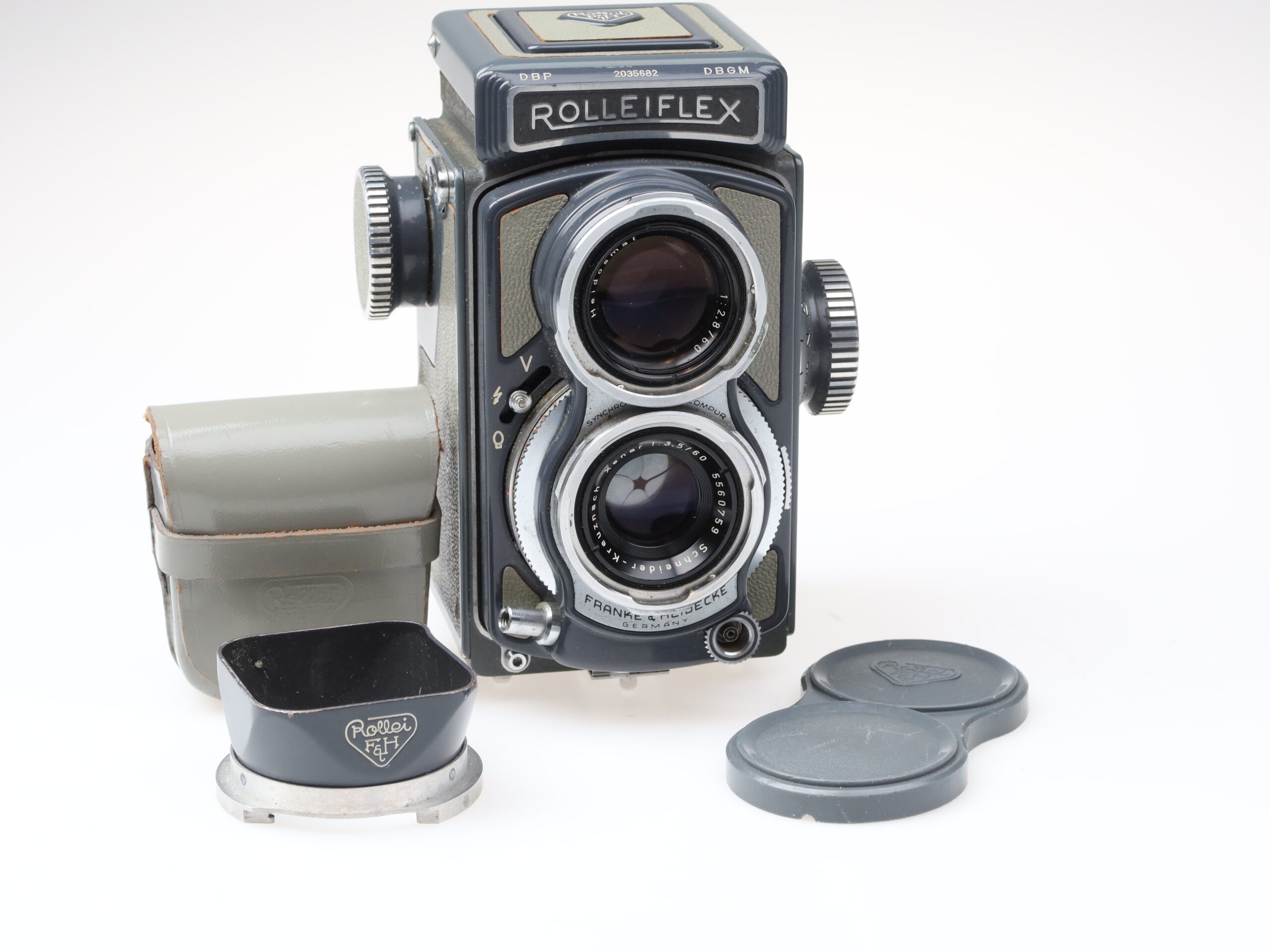 Rollei Rolleiflex 4×4 Baby gray camera (No. 2035682) with Schneider-Kreuznach Xenar 60mm f3.5 lens (No. 5570759).